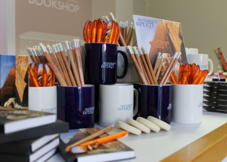 Cataloghi a partire da 5,00 €, i gadgets di Monumenti Aperti tutti a 1 € - 3 € la tazza.